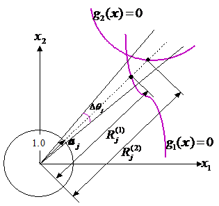 降階積分法同樣能夠求解結(jié)構(gòu)系統(tǒng)的失效概率,設系統(tǒng)由個失效模式組成,對結(jié)構(gòu)系統(tǒng)按照單模式的情形將坐標空間離散為眾多微元體,與單模式不同的是每個微元體與結(jié)構(gòu)系統(tǒng)的失效域的交點處的特征半徑(仍以表示之)需按下面的方法確定。