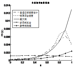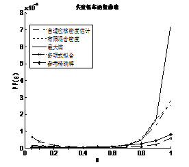 算例8.28.3所示的Y型節(jié)點管,剖面AA的載荷為軸向力,面內(nèi)彎矩,截面彎矩,極限狀態(tài)方程為。其中為互不相關(guān)的正態(tài)分布隨機變量,其分布參數(shù)見81。的分布取為均值為2×103、標(biāo)準(zhǔn)差為0.5×103的正態(tài)分布。本例運用Monte Carlo抽樣105的樣本點,得到760個失效樣本來估計條件密度函數(shù)。以下給出四種擬合方法所得到的失效概率函數(shù)和全局靈敏度的曲線圖。